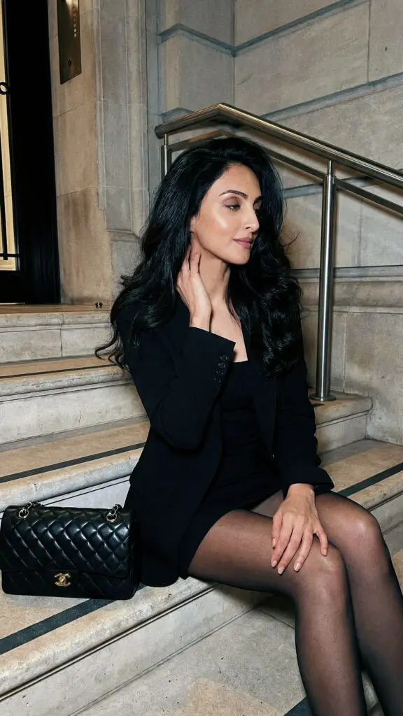 A black blazer over a fitted mini dress is a dinner-date classic that never fails. This look feels polished, confident, and incredibly versatile. The tailored blazer adds structure, while the mini length keeps it modern and feminine. Styled with sheer tights and a quilted handbag, it’s ideal for chic restaurants, rooftop dinners, or elegant evening plans.