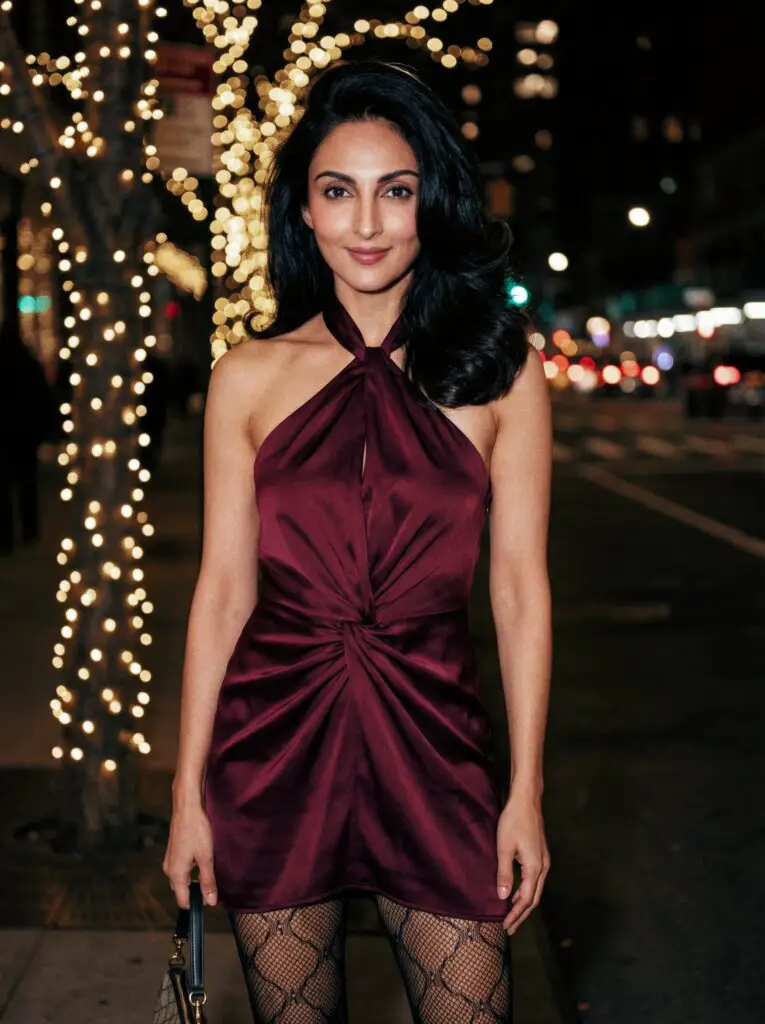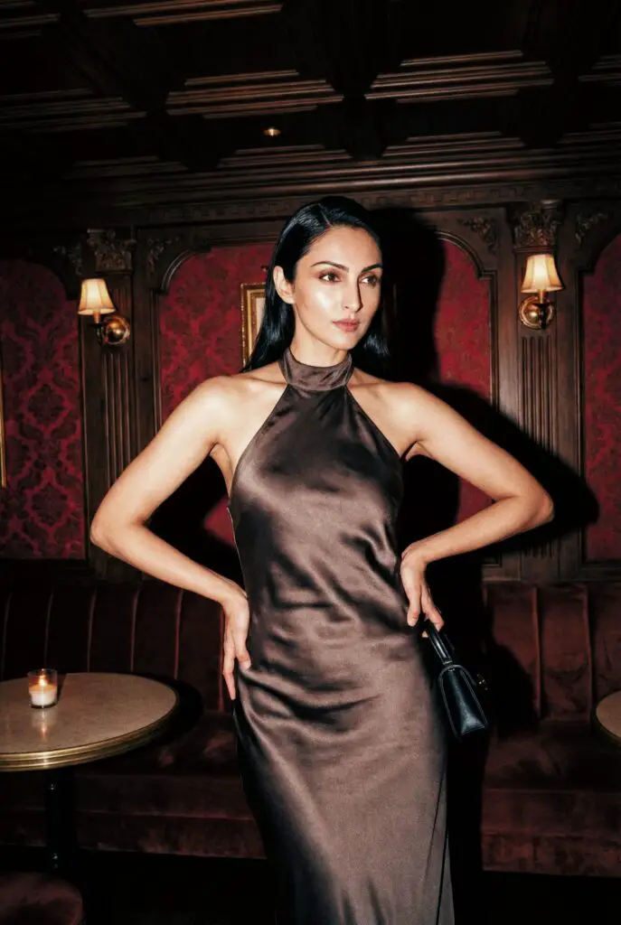 This espresso-brown satin halter dress is pure understated glamour. The silky fabric drapes beautifully, creating a sleek silhouette that feels luxurious and refined. With minimal accessories and a structured handbag, this look is perfect for intimate fine-dining experiences. Elegant, timeless, and quietly powerful—this is dinner-date style done right.