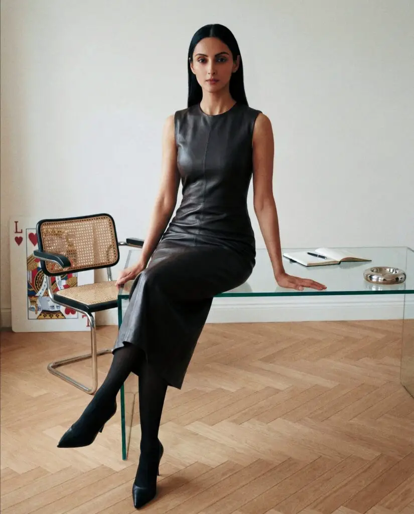 This sleek chocolate-brown leather midi dress is the definition of quiet luxury. Clean lines, a structured fit, and rich texture make it perfect for upscale dinner dates. Styled with sheer tights and pointed heels, the look feels confident, modern, and intentional. It’s bold without being loud—ideal for women who prefer elegance that speaks softly but leaves a lasting impression.