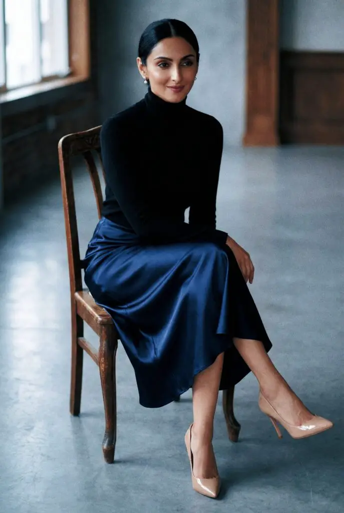 A fitted black turtleneck paired with a deep blue silk skirt is a masterclass in classic elegance. The contrast of matte and shine creates visual interest while keeping the look sophisticated. Nude heels soften the outfit, making it perfect for upscale dinners or elegant date nights. Simple, confident, and effortlessly classy—this look never goes out of style.