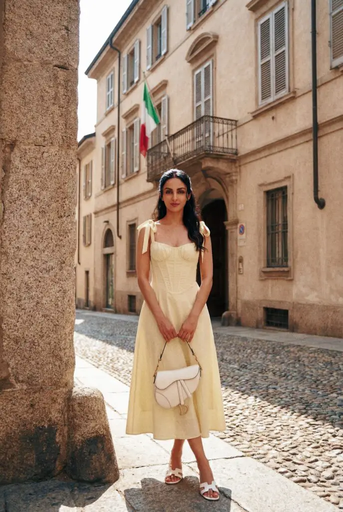This soft yellow midi dress feels light, romantic, and effortlessly graceful. The structured bodice enhances the silhouette, while the flowing skirt adds movement and charm. Paired with delicate sandals and a neutral handbag, it’s perfect for outdoor dinners, European vacations, or sunlit evening dates. A dreamy outfit that feels warm, feminine, and beautifully timeless.